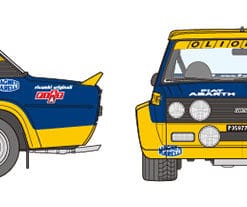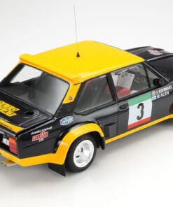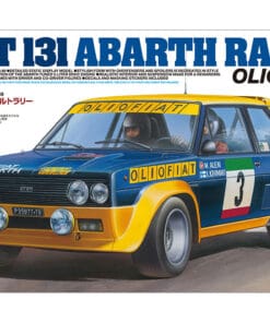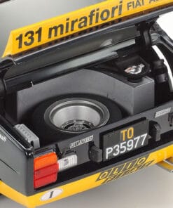 | Enter a Champion! The Fiat 131 Abarth Rally is the front engine rear drive car which made a rally debut in 1976 and took titles in ’77, ’78 and ’80. The famous Italian car-tuning brand Abarth developed this car as an Abarth-tuned version of the Fiat 131 Mirafiori with 1,995cc inline-4 DOHC 4-valve engine capable of 215hp, and 4-wheel independent McPherson strut suspension with front/rear ventilated disc brakes. Also, it was extremely lightweight thanks to extensive use of FRP and aluminum across its body. The version of 1976 and 1977 was finished in a navy blue and yellow livery based on the colors of Olio Fiat. |