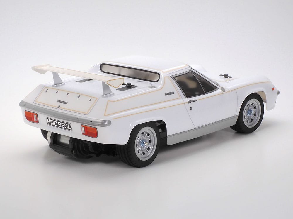 | A Special One The Lotus Europa debuted in 1966, showcasing what was then a revolutionary midship layout, with a lightweight FRP body, and making a global splash thanks in part to its top-class cornering. In 1972, perhaps the finest model in the series was released – the Europa Special with 126hp, 1.6-liter inline-4 engine, optional 5-speed transmission and aluminum wheels. This R/C model assembly kit recreates the Europa Special developed by legendary Lotus founder Colin Chapman. A polycarbonate body captures the sharp, low-slung form in style, with separate parts for light cases, side mirrors and rear wing. Stickers are included for decoration of the model, including depiction of stylish gold pinstripe details. |