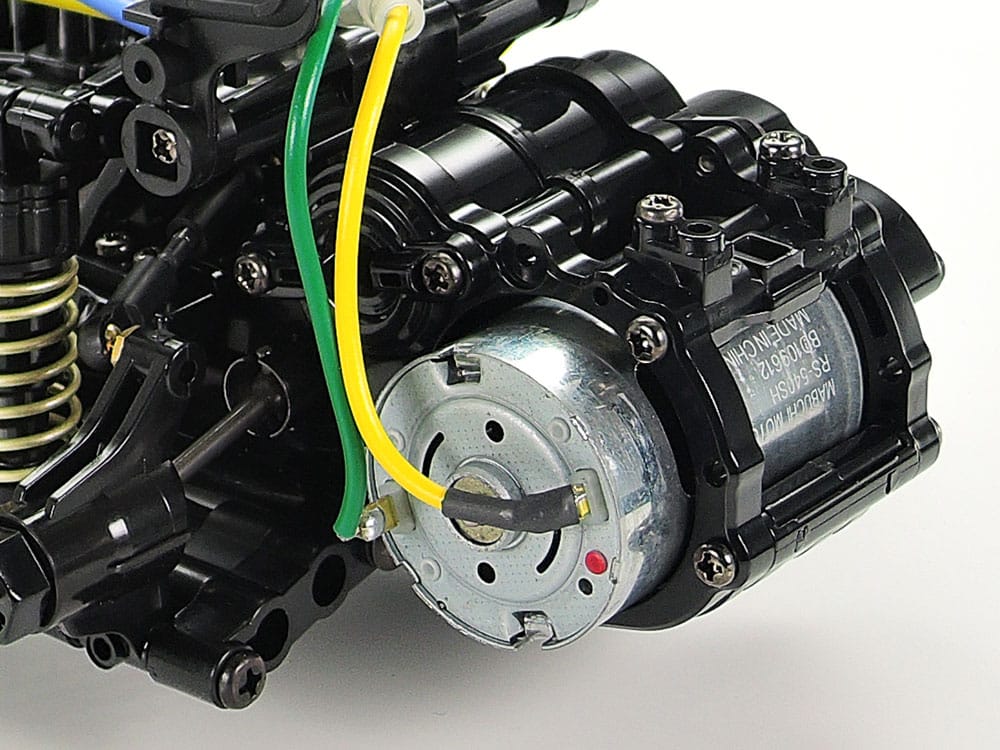 | Great RR Performance from the M-06 The M-06 chassis features a rear-mounted motor, rear-drive setup and has a longitudinally-mounted battery pack, with R/C equipment positioned on either side for optimum balance and a low center of gravity. 4-wheel double wishbone suspension uses dish design wheels, equipped with 60D radial tires at the front and 60D super radial (hard) tires at the rear. In addition, a 3-piece steering linkage offers nimble handling response. |